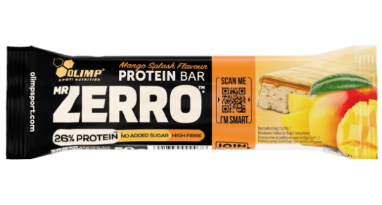 Olimp MR ZERRO PROTEIN BAR **Wysokobiałkowy baton (26% białka) w białej czekoladzie (18%), z warstwą o smaku mango (17%), mango liofilizowanym (1,5%), z dodatkiem wybranych witamin i składników mineralnych. Zawiera substancję słodzącą. *Bez dodatku cukrów. Zawiera naturalnie występujące cukry. Z wysoką zawartością błonnika pokarmowego.